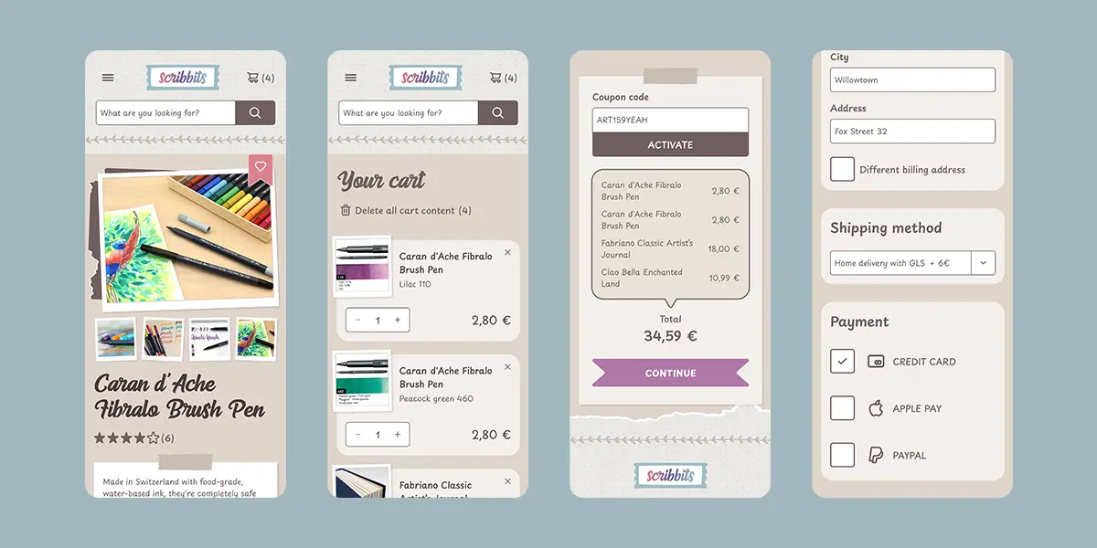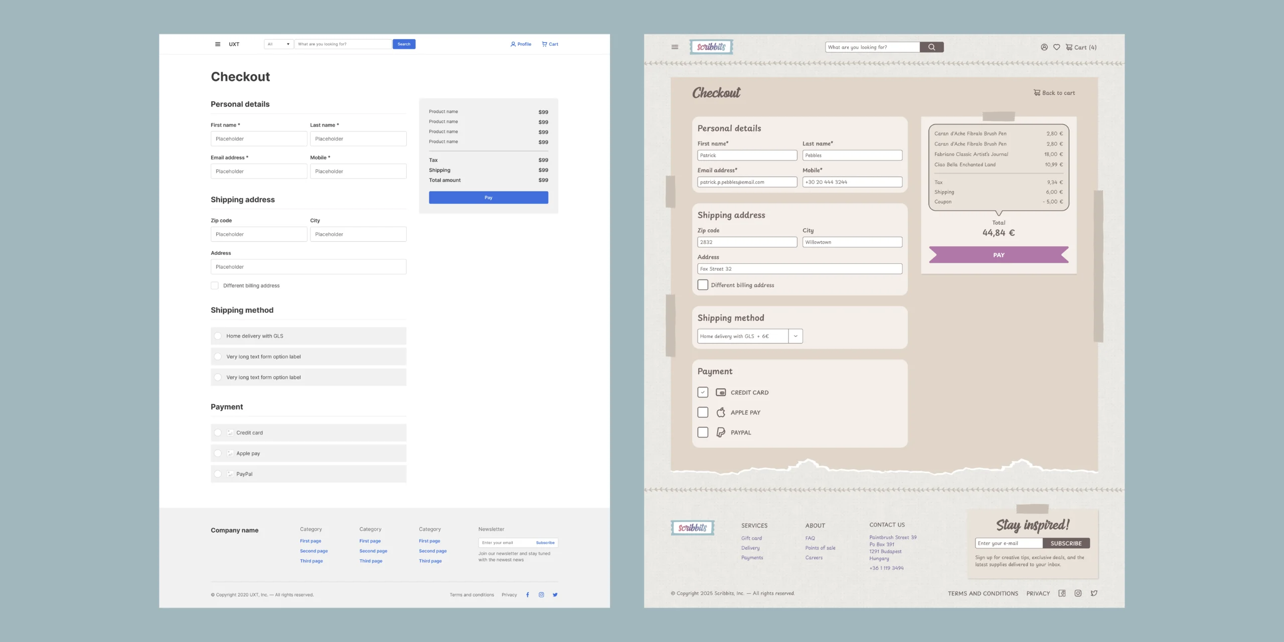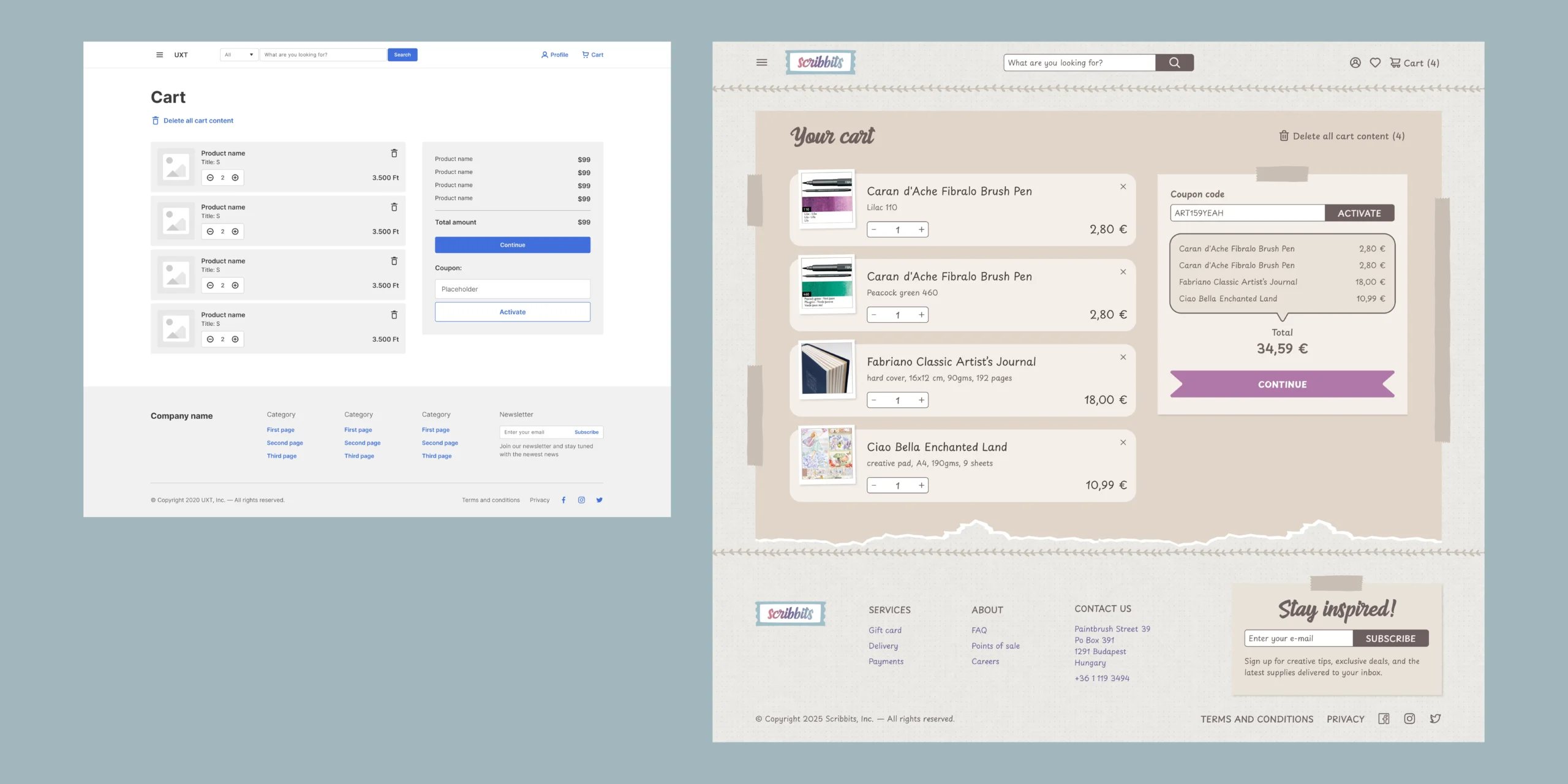 Adott UX drótváz alapján megtervezni egy kreatív designt, ami nem csak illik a témához, de kiemeli az oldalt a versenytársak közül egyedi megjelenésével. Fontos, hogy a UI telefonos kijelzőn is jól működjön, hiszen sok felhasználó ilyen felületen tekinti meg a webshopokat.